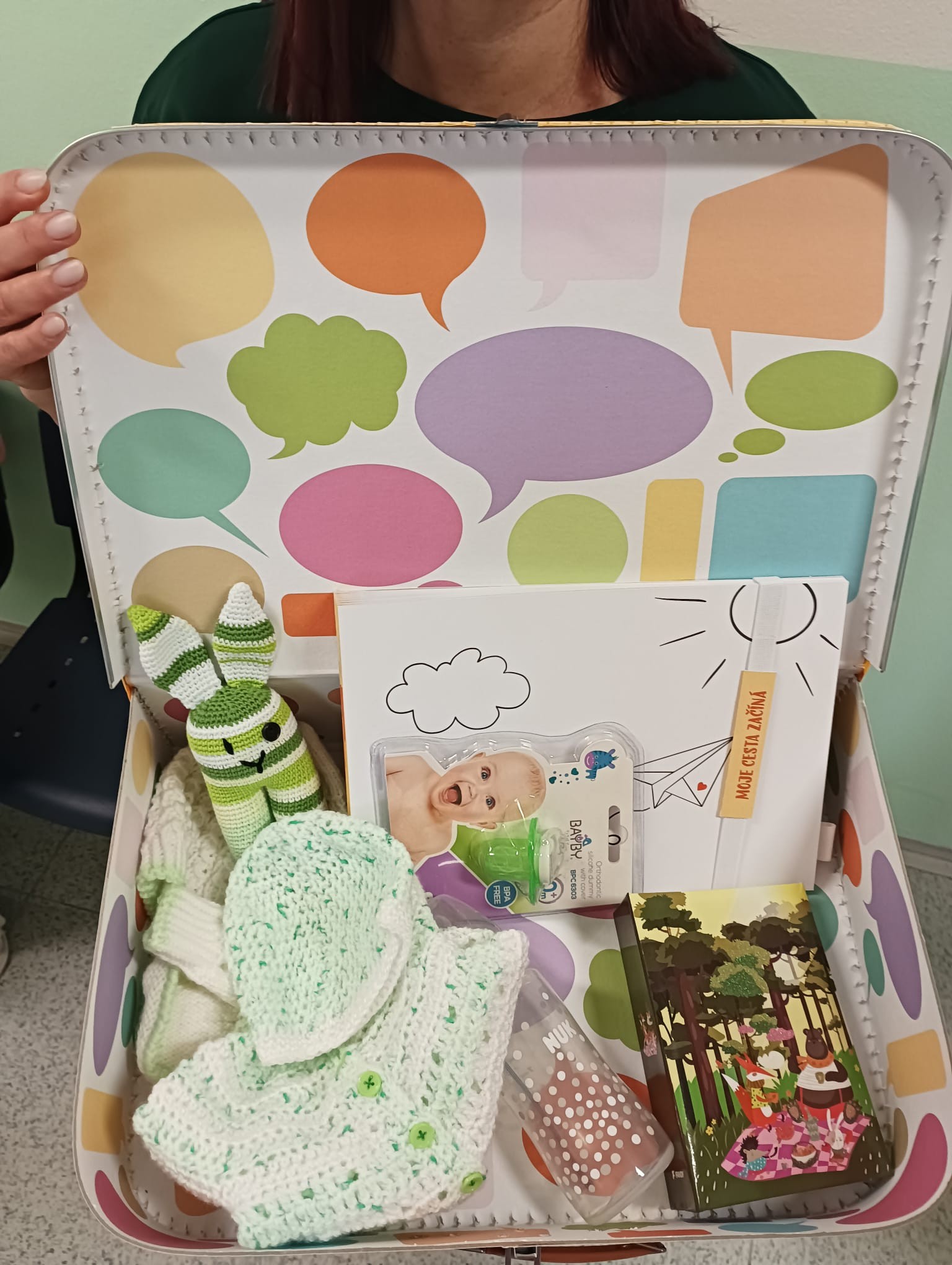 Do kufříku, který děťátko dostane, mohou zdravotníci ukládat fotky, osobní vzkazy i případné dárečky. Součástí kufříku jsou také dárky od dobrovolníků z celé země, háčkované a pletené oblečky, lahvička, dudlík, fotoalbum a památník prvních důležitých událostí v životě miminka. Tento kufřík pak s dítětem pokračuje celý život a postupně se plní.