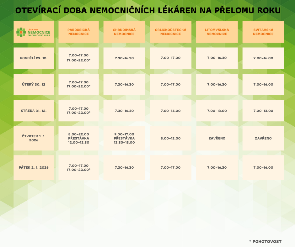 V období od 29. prosince 2025 do 2. ledna 2026 dochází k úpravě otevírací doby jednotlivých lékáren Nemocnice Pardubického kraje.