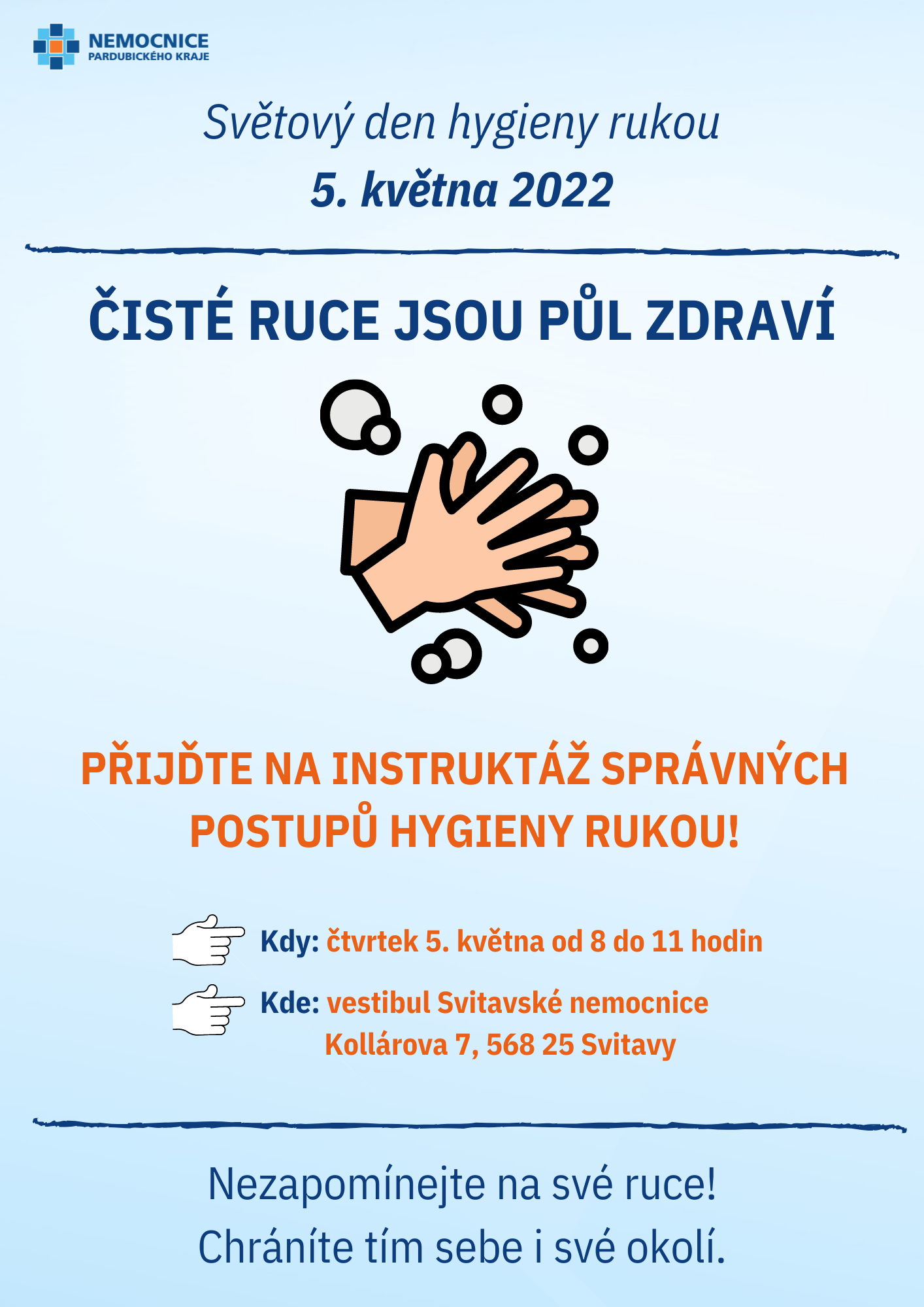 Instruktáž správných postupů hygieny rukou se uskuteční ve vestibulu Svitavské nemocnice ve čtvrtek 5. května 2022 od 8 do 11 hodin.